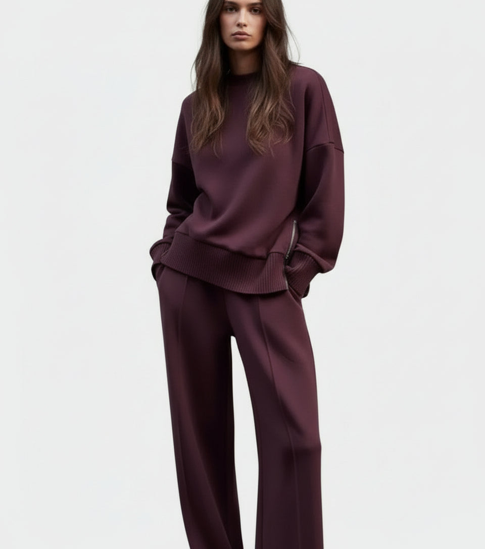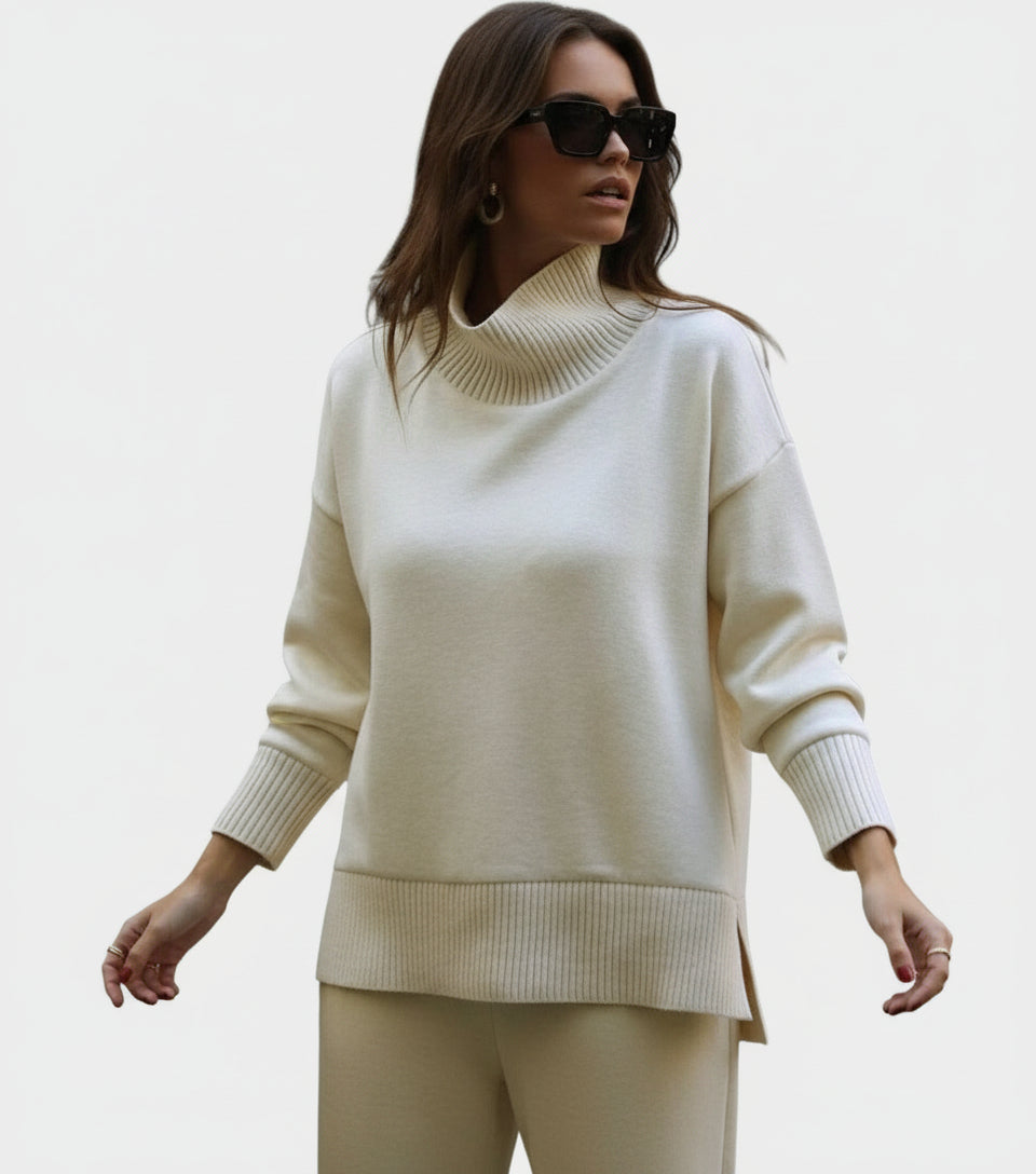 Un conjunto que une comodidad y sofisticación. El suéter de cuello alto con cremallera lateral ofrece un toque moderno y práctico, mientras que la tela suave asegura calidez y agradabilidad sobre la piel. Los pantalones anchos con cintura elástica y bolsillos laterales añaden funcionalidad y libertad de movimiento.