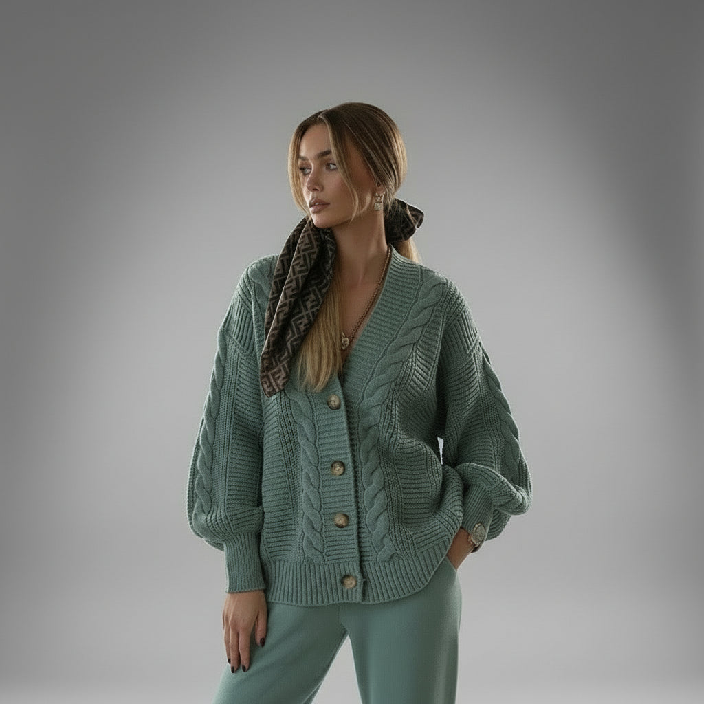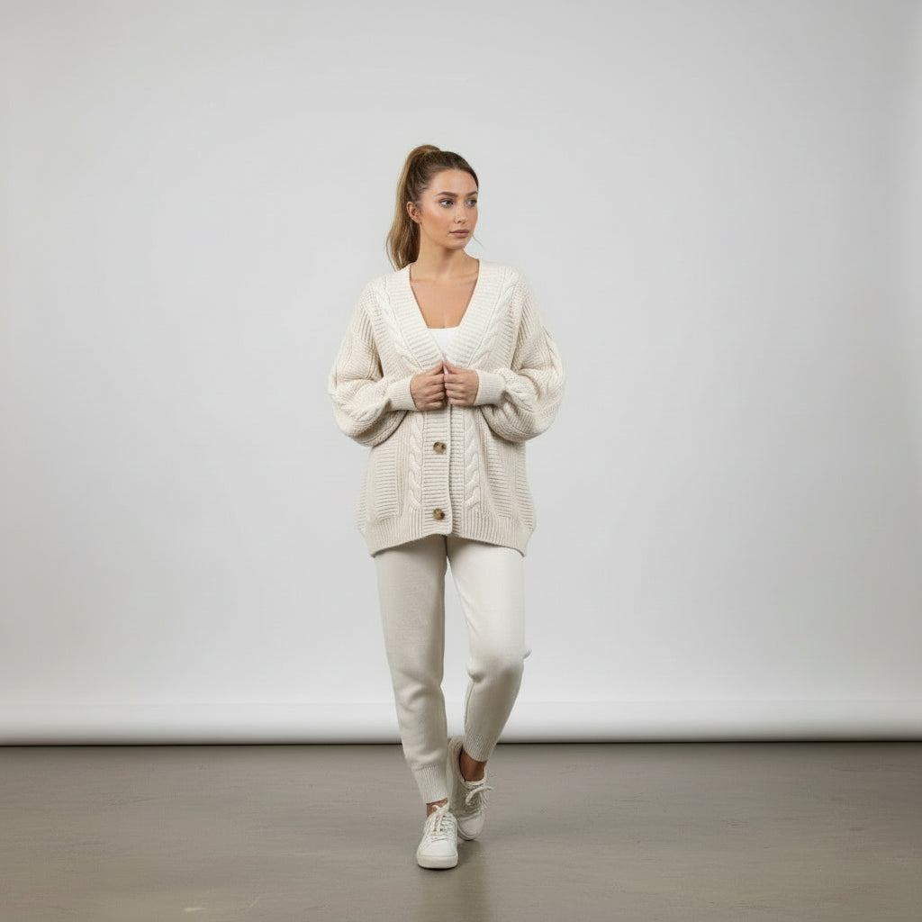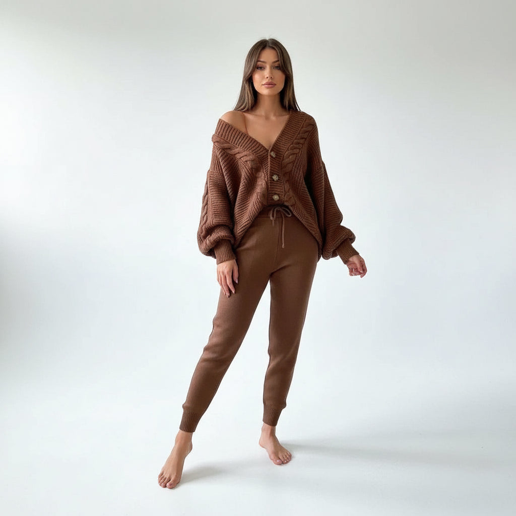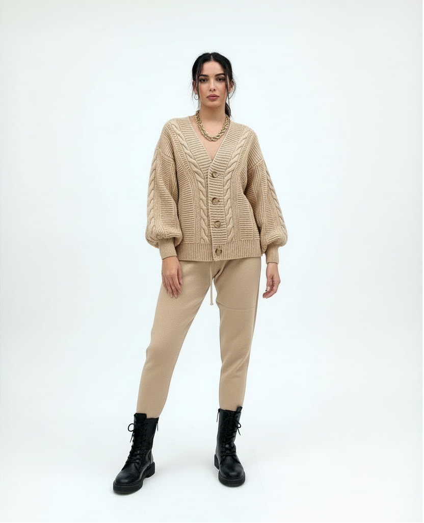 • Corte favorecedor en 2 piezas – Cárdigan entallado + pantalón de tiro alto para una silueta estilizada