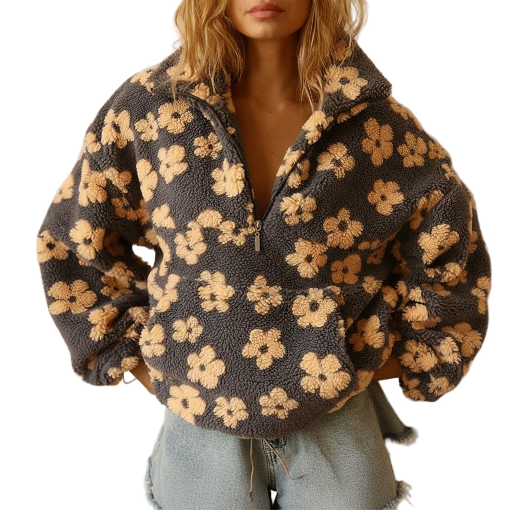 Sumérgete en una comodidad absoluta con este suéter polar de sherpa ultra suave, tan acogedor como un abrazo cálido. Su estampado floral de inspiración bohemia aporta un toque original, mientras que su corte ligeramente oversize garantiza un look relajado y moderno.