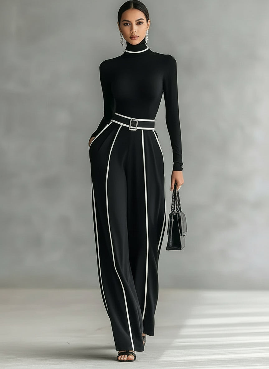 Compuesto por un top ajustado de cuello alto y un pantalón fluido de pierna ancha resaltado con líneas contrastantes, este conjunto ofrece una silueta estilizada y ultra moderna.